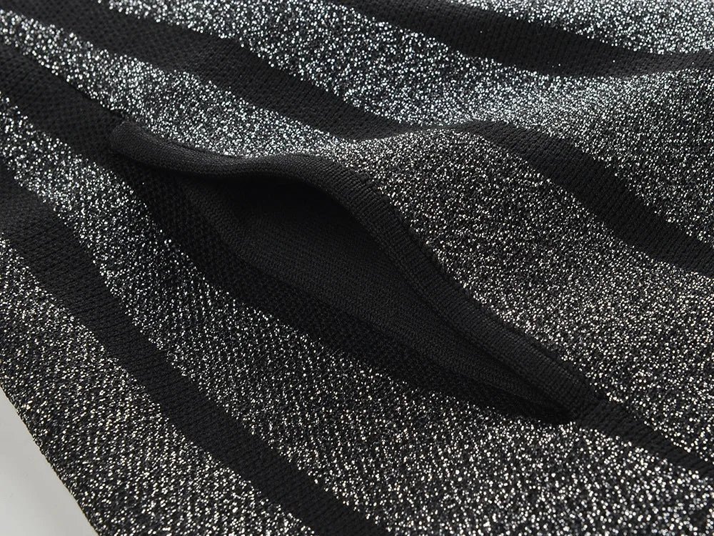 Add a bold twist to your wardrobe with this stunning black and silver mini dress. Crafted from a stretch-knit fabric, it features vertical metallic threading that elongates the silhouette, while the pleated skirt brings playful volume and movement. The fitted bodice and wide straps provide structure and comfort, making it a flattering choice for all body types.