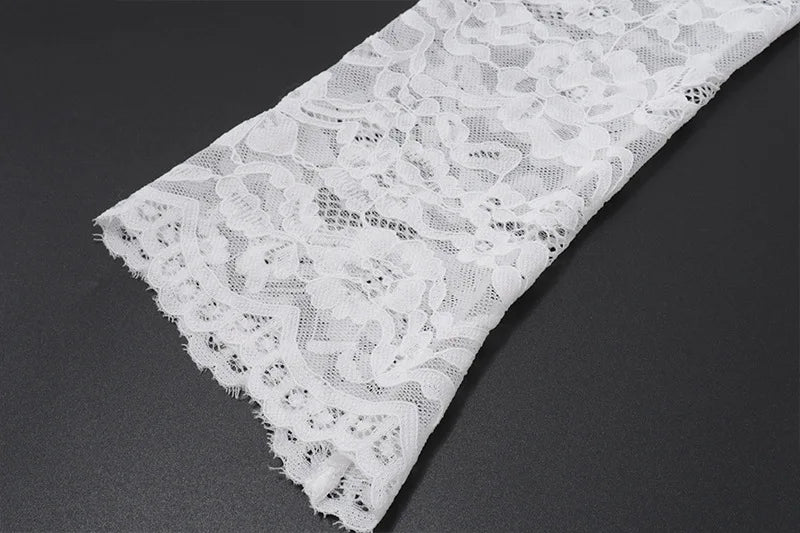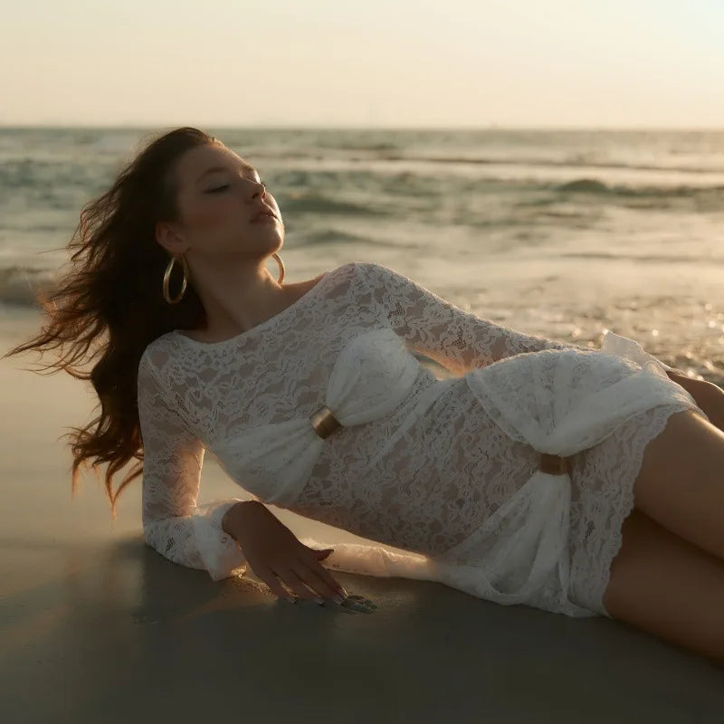 Turn heads on every shoreline with this white lace beach mini dress, designed for women who love effortless elegance. Crafted from delicate floral lace, this see-through cover-up features long bell sleeves, a boat neckline, and a body-hugging silhouette that highlights your natural curves. The front is accented with a statement bow detail at the bust and waist, adding a touch of femininity while creating a flattering, sculpted shape.